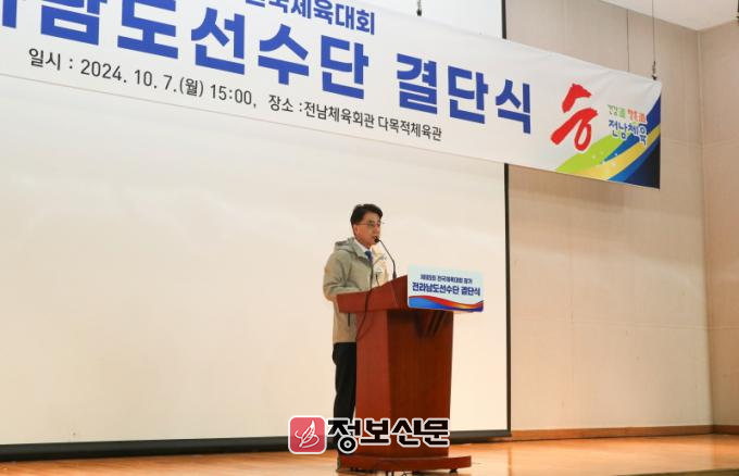 김태균 의장은 이날 축사를 통해 “오늘 우리는 제105회 전국체육대회 출전을 앞두고 필승의 각오를 다지기 위해 이 자리에 모였다”며 “끝없는 노력과 인내로 훈련에 임하며 준비했고 그 헌신과 열정에 180만 전남도민을 대신해 깊은 감사의 마음을 전한다”고 말했다.