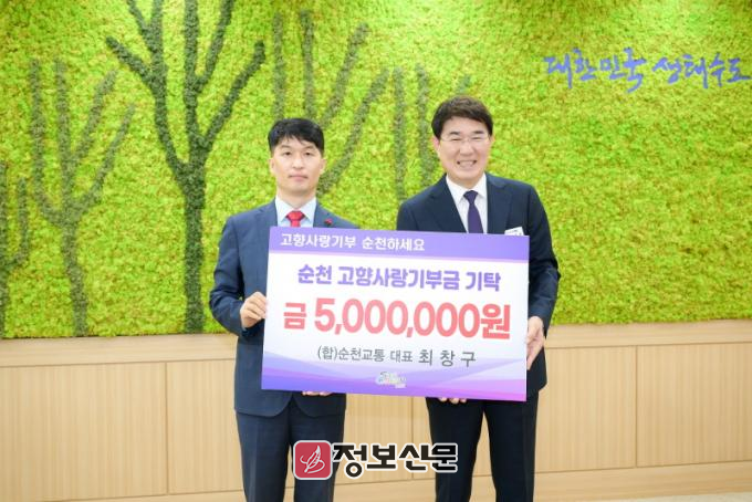 시는 7일 (합)순천교통 최창구 대표가 순천시청을 방문하여 고향사랑기부금 1인 연간 최대 한도액인 500만원을 기탁했다고 밝혔다.
