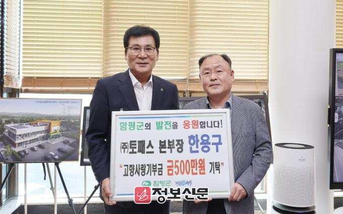 주식회사 토페스는 국내 최초로 무인교통단속 시스템과 영상식 차량검지기 개발에 성공한 회사로, 산업용 CCTV를 중화학 분야에 공급하는 등 뛰어난 기술력을 갖춘 기업이다. 한용구 본부장은 “함평군을 마음의 고향으로 간직하며, 매년 기부를 이어갈 예정”이라며, “이런 기부가 모여 함평군 발전의 밑거름이 되길 바란다”고 전했다.