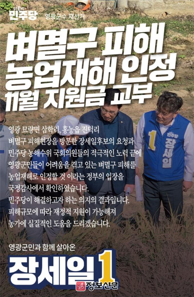 ![]() 장세일 민주당 영광군수 후보, ″영광군 벼멸구 피해 농가 보상받는다″ |