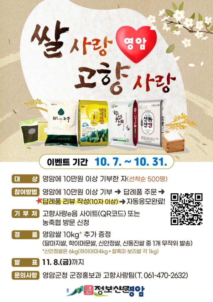 영암 쌀 판매와 고향사랑기부 촉진을 병행하는 이 이벤트는, 답례품에 3만원 상당의 영암 쌀을 추가로 제공하는 내용.