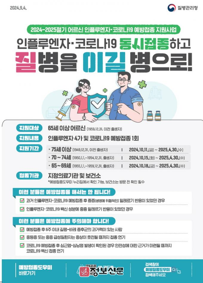이번 예방접종은 특정 기간 쏠림을 방지하기 위해 연령대별 순차적으로 진행되며 ▲75세 이상은 10월 11일부터, ▲70세~74세는 10월 15일부터, ▲65세~69세는 10월 18일부터 순차적으로 시작한다. 65세 이상 어르신은 접종 부위를 달리해 코로나19와 인플루엔자 동시 접종을 권고하며, 주소지와 관계없이 지정 위탁의료기관에서 무료로 접종할 수 있다.