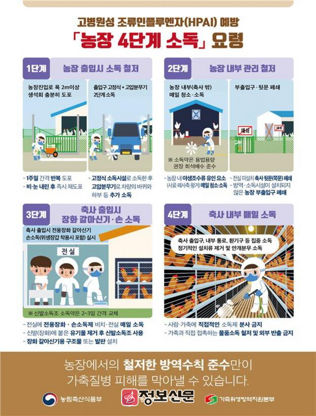 또한, “내 농장은 내가 지킨다는 마음으로 차단 방역 5대 수칙과 농장 4단계 소독 요령을 철저히 준수해줄 것”을 당부했다.