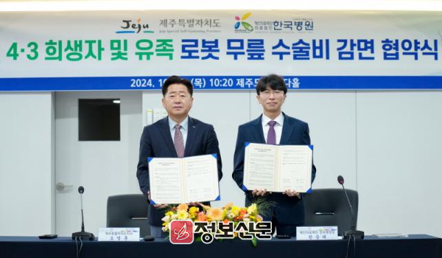 제주도는 10일 오전 10시 20분 제주도청 삼다홀에서 혜인의료재단과 ‘4·3희생자 및 유족 로봇 무릎 인공관절 수술비 감면사업’을 위한 업무협약을 체결했다.