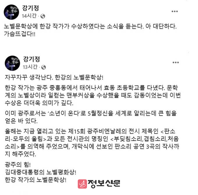 강 시장은 이날 페이스북에 “한강 작가는 광주 중흥동에서 태어나서 효동초등학교를 다녔다”며 “문학계의 노벨상이라 일컫는 맨부커상을 받았을 때도 감동이었는데, 이번 수상은 더더욱 의미가 깊다”고 축하했다.