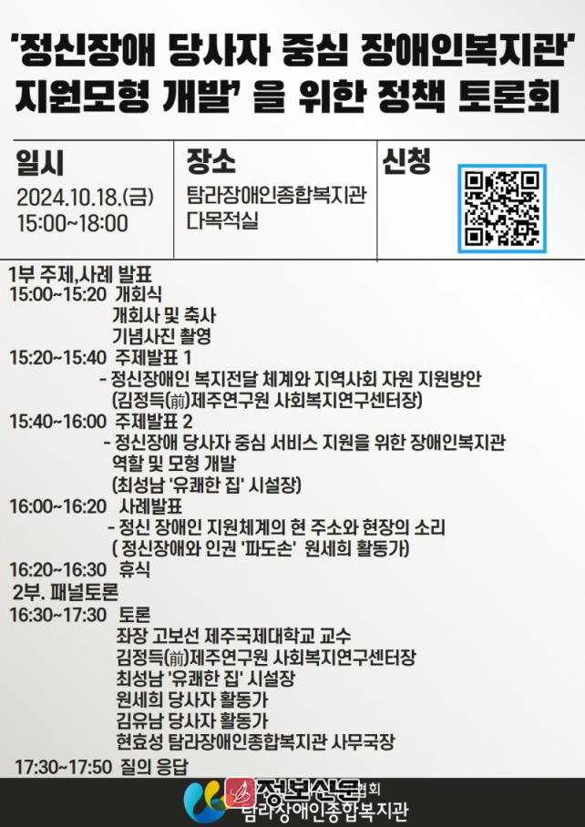 ![]() 탐라장애인종합복지관, 정신장애 당사자 중심 장애인복지관 지원 모형 개발을 위한 정책 토론회 개최 |