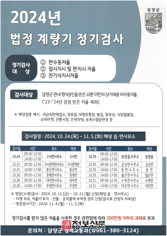 담양군 관계자는 “정기 검사를 받지 않는 경우 계량에 관한 법률에 따라 과태료 처분 등 불이익을 받을 수 있으니 기간 내 검사를 받으시길 바란다”라고 말했다.