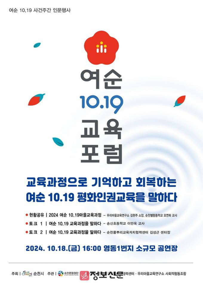 18일 영동1번지 소규모 공연장에서 진행되는 여순사건 교육 포럼은 여순 10.19 마을교육 과정의 개발과 실행 사례를 공유하고 참여 학생과 유족, 교사들의 이야기로 구성됐다. 이어 오후 6시부터는 여순사건의 희생자를 추모하기 위한 추모전야제가 이어진다. 이번 추모전야제에서는 시민들이 참여하는 ‘평화염원 순천시민합창단’을 구성하여 여순창작 음악극 ‘그해 10월’을 선보인다.