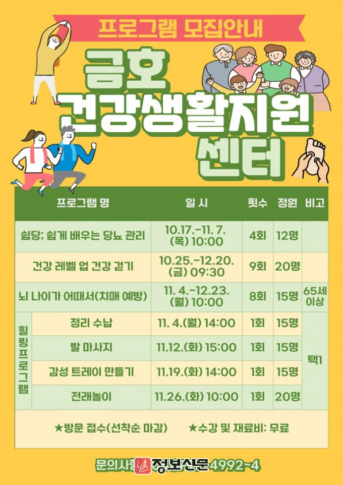 ‘건강레벨업 건강걷기’는 금호건강생활지원센터 주변 산책길 코스를 발굴해 걸어보는 프로그램으로 건강한 생활 습관을 갖고자 하는 주민 누구나 쉽게 참여할 수 있다. 11월부터는 65세 이상 주민을 대상으로 뇌(腦)나이가 어때서’ 치매예방교육이 진행된다.