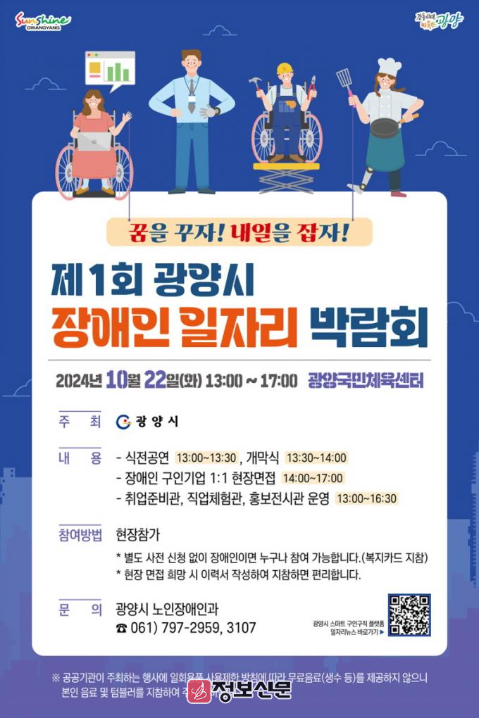 광양시는 오는 22일 광양국민체육센터에서 “꿈을 꾸자! 내일을 잡자!”라는 슬로건으로 ‘제1회 장애인 일자리 박람회’가 개최된다고 밝혔다.