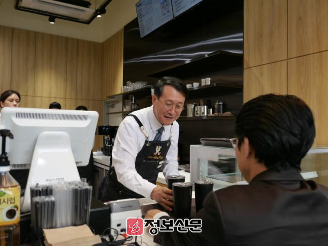 ![]() 15일 열린 제주대학교 내 아카페라 개소식에서 김일환 총장이 일일 바리스타로 나서 직접 시연을 진행했다. |