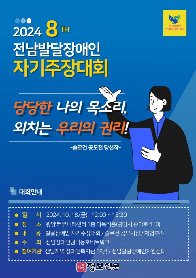 사전 공모와 투표를 통하여 선정된 ‘당당한 나의 목소리, 외치는 우리의 권리!’ 슬로건으로 2024년 발달장애인 자기주장대회가 진행되며 대회 참여는 전남지역 장애인복지관 18곳에서 선발된 발달장애인들이 출전하여 자립 생활을 주제로 발달장애인 당사자 자신의 이야기를 무대에서 표현한다.