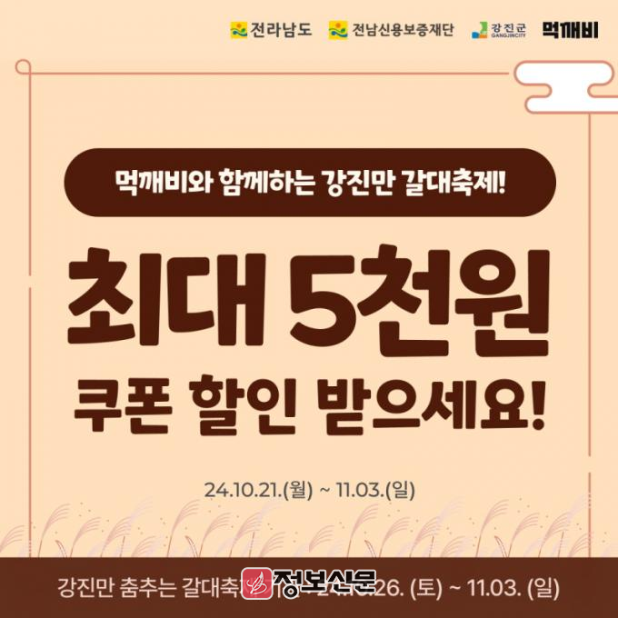 축제가 시작되는 10월 26일 토요일을 포함한 주말 4일간은 기존에 추진 중인 ‘강진군 주말 3천 원 할인 쿠폰’과 중복 사용이 가능한 2천 원 할인 쿠폰이 매일 선착순 400명에게 제공되어, 축제 기간 내내 5천 원의 할인 혜택이 받을 수 있다.