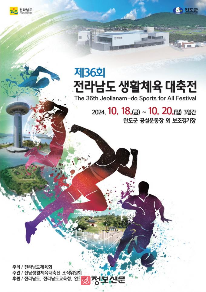 10월 18일부터 20일까지 3일 동안 완도공설운동장 및 완도군 일원경기장에서 열리는 제36회 전라남도생활체육대축전은 ‘치유의 섬 완도에서 화합하는 전남생활체육 대축전’이라는 주제 아래 전남 22개 시‧군 생활체육인 6,655명의 선수단이 참가, 24개 종목(정식 22, 민속 1, 시범 1)에서 기량을 겨룬다.