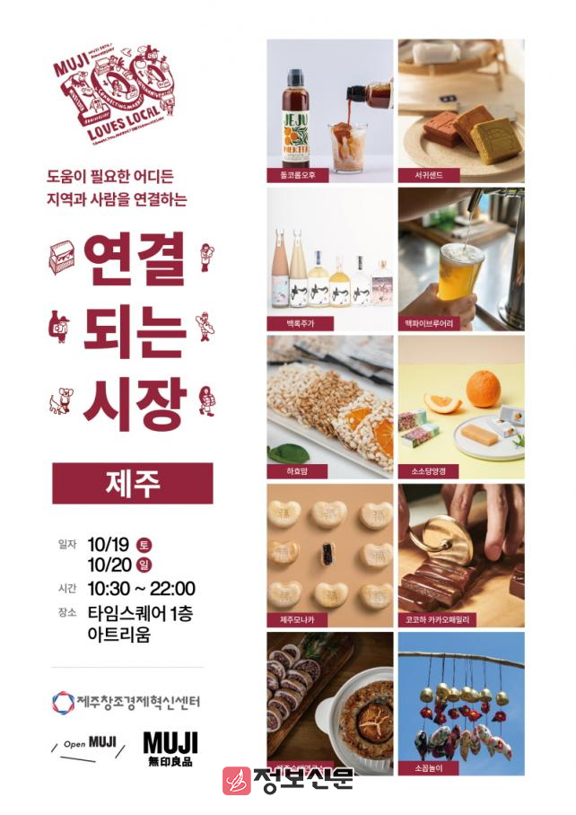 제주센터는 지난 8월 ‘연결되는 시장 제주편’을 무인양품과 공동 개최했다. 이번에도 로컬기업 부스를 운영해 ▲(주)카카오패밀리 ▲메밀리 ▲서귀샌드 ▲제주순대연구소 ▲백록주가 ▲맥파이브루어리 ▲소꼽놀이 ▲하효맘 ▲돌코롬오후 ▲소소당양갱 까지 10개의 로컬 기업을 출점한다.