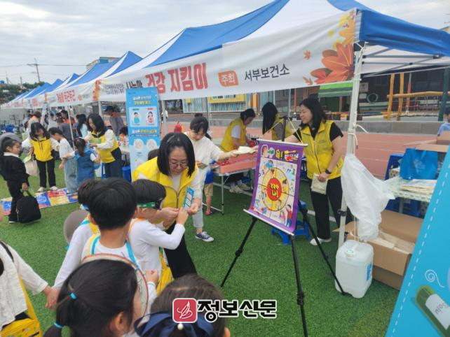 서부보건소 건강 체험부스에서는 △음주고글 체험을 통한 음주폐해 예방 체험교육 △볼링교구를 이용한 올바른 손씻기 체험교육 △OX퀴즈를 활용한 아동·청소년 정신건강증진 체험교육을 운영하였으며. 참여한 어린이들에게 에코백, 노트펜 세트 등 다양한 건강 홍보물품을 제공하였다.