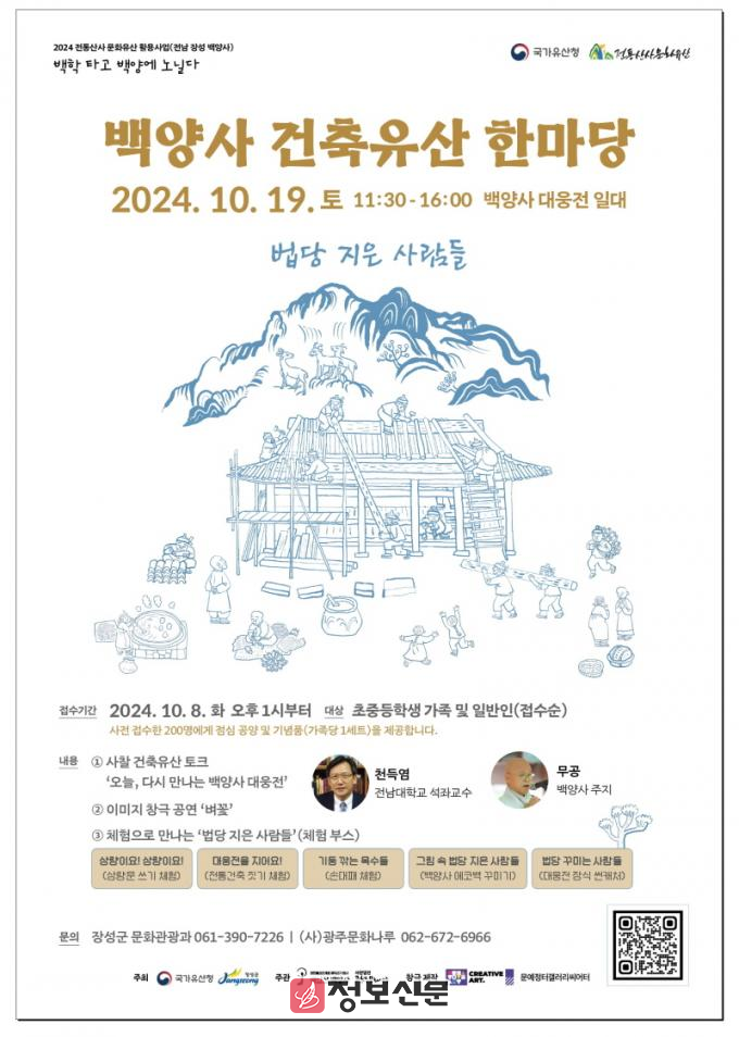 장성군과 국가유산청이 주최하고 백양사, 광주문화나루가 주관하는 ‘건축유산 한마당 – 법당 지은 사람들’은 전통산사 문화유산 활용사업의 일환으로 마련된 문화‧예술 프로그램이다.