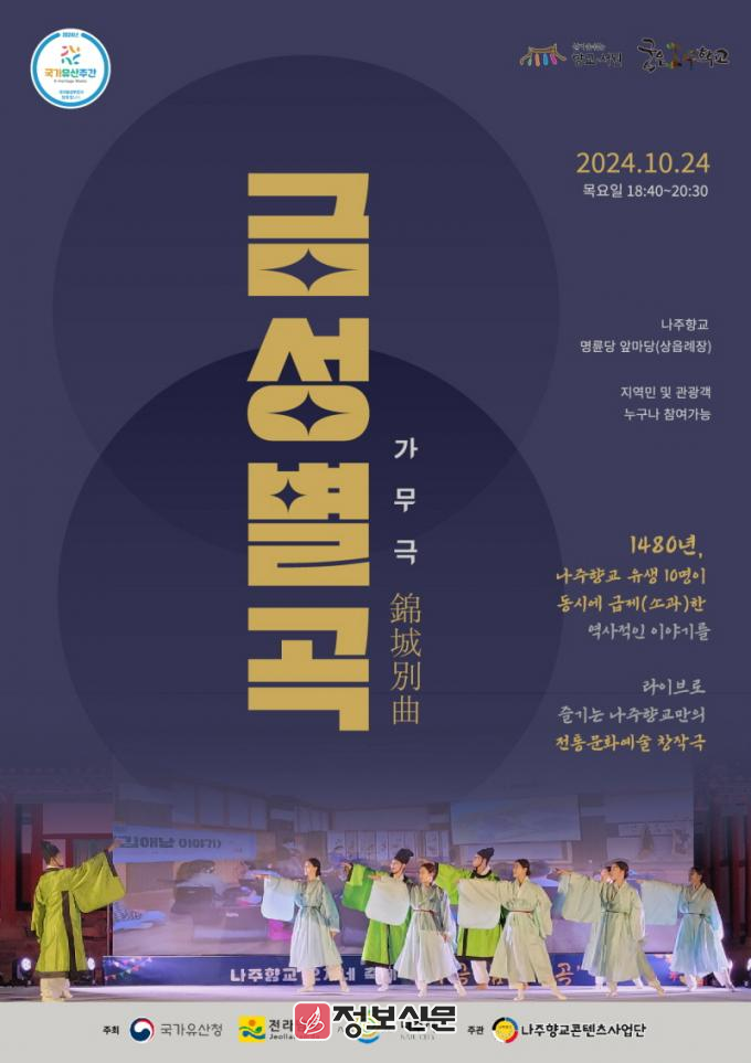 ‘금성별곡’ 공연은 국가유산청 향교·서원 문화유산 활용사업으로국가유산주간(10월11일~11월3일)에 전국에서 운영되는 지역 유산축전이다.