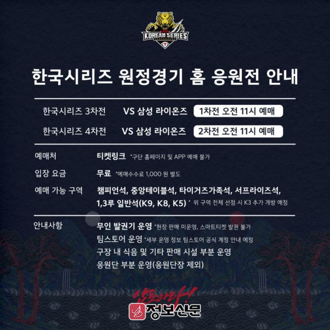 좌석은 챔피언석, 중앙테이블석, 타이거즈가족석, 서프라이즈석, 1,3루 일반석에 한하여 개방되며, 해당 좌석이 모두 선점될 경우 K3 좌석을 추가로 개방할 계획이다. 외야석과 에코다이나믹스 가족석, 스카이피크닉석, 4층 파티석, 스카이박스는 개방하지 않는다. 타이거즈 팀스토어와 식음료 매장 일부도 정상 운영한다.