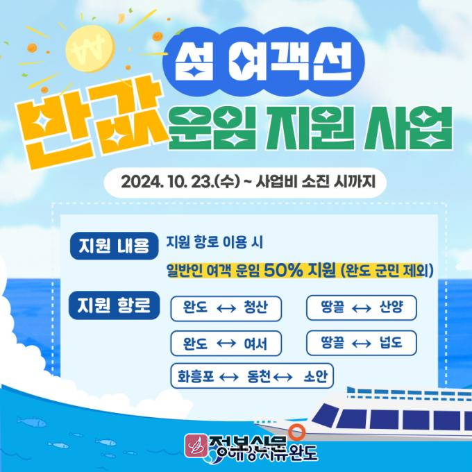‘반값 여객선 운임제’는 ‘청정 완도 가을 섬 여행’ 행사 기간을 맞아 청산도, 소안도, 노화도, 여서도, 노화(넙도)를 방문하는 일반인(완도군민 제외)에게 여객 운임 비용을 지원하는 사업이다.
