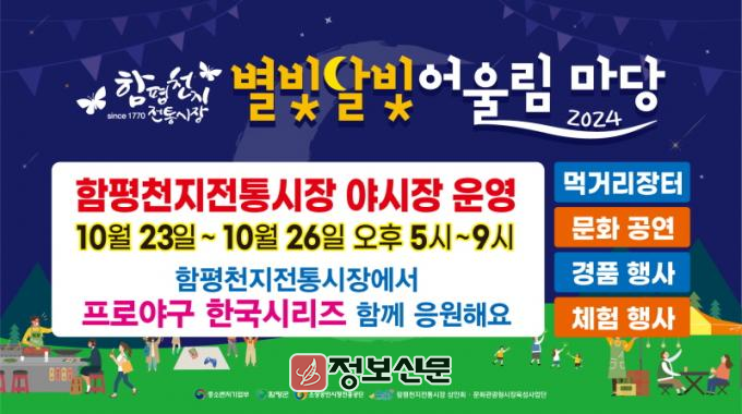 별빛달빛어울림마당 야시장 행사는 10월 23일부터 10월 26일까지 오후 5시부터 9시까지 함평천지전통시장에서 프로야구 한국시리즈를 관람하며 야시장을 즐길 수 있다.