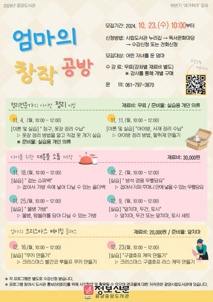 광양중앙도서관은 양육과 가사에 지친 엄마들에게 실질적인 도움을 주고 다양한 육아 정보를 제공하고자 프로그램을 마련했다. 강좌는 ▲정리전문가의 아이방 정리 비법 ▲아이를 위한 재봉틀 소품 제작 ▲엄마의 크리스마스 베이킹 클래스 수업으로 구성했다.