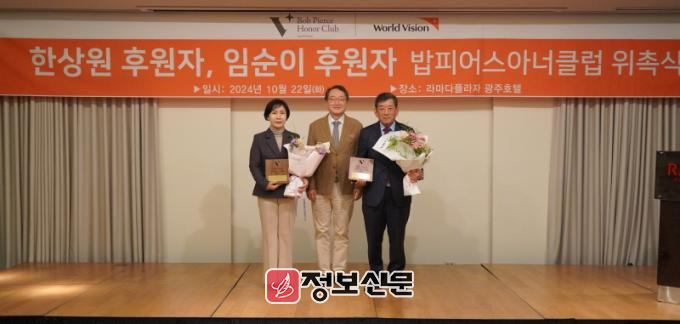 ![]() 월드비전은 한상원 광주상공회의소 회장 겸 ㈜다스코 대표이사와 임순이 삼성생명 명예사업부장 겸 조선대학교 겸임교수를 ‘밥피어스아너클럽’에 위촉했다고 22일 밝혔다. (왼쪽부터) 임순이 상무, 조명환 회장, 한상원 회장이 기념사진을 촬영하고 있다. (사진 제공 = 월드비전)