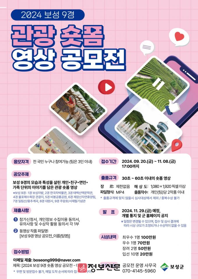 ![]() 보성군, 2024 보성 9경 관광 숏폼 영상 공모전 개최 |