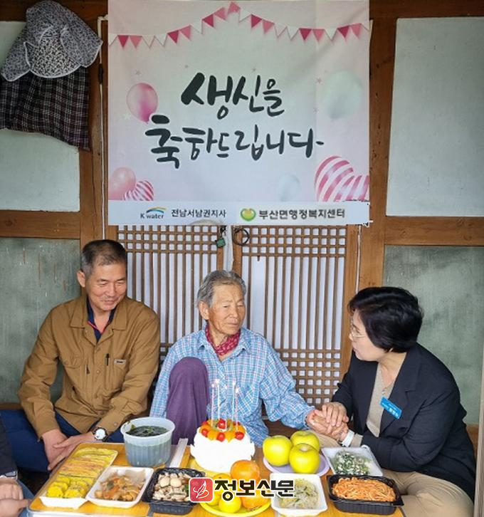 장수 어르신 생신상 차려드리기 사업은 K-water 전남서남권지사(지사장 김재학)의 후원으로 추진되며, 부산면에 실제 거주하는 90세 이상 어르신을 대상으로 생일에 직접 찾아가 미역국, 전, 반찬, 제철 과일과 케이크로 생신상을 차려드리고 안부를 살피는 사업이다.