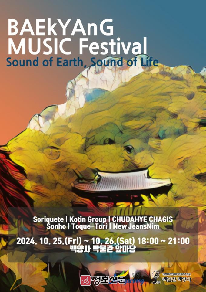 음악회가 열리는 곳은 백양사 성보박물관 앞 특설무대다. 먼저 첫날인 25일 오후 5시부터 국악과 플라멩코 음악을 넘나드는 ‘소리께떼’, 9인조 라틴재즈밴드 ‘코틴그룹’, 무가(巫歌)에 다양한 장르의 리듬을 결합한 음악을 들려주는 ‘추다혜차지스’가 관객과 만난다.