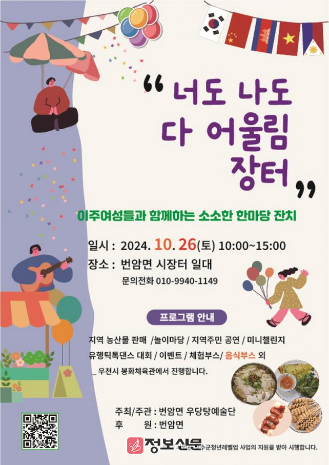 번암우당탕예술단(대표 오선진)이 주관하는 ‘너도나도 다어울림 장터’는 26일 번암면 시동강 천변공원에서 개최되며 이주 여성들이 준비한 다양한 세계 음식을 포함해 여러 체험 프로그램과 공연이 진행된다. 지역주민들과 이주 여성들이 함께 마련할 이번 행사는 번암면의 특색을 알리고 서로 다른 문화를 존중하고 공감하는 화합의 장으로 꾸미고자 한다.