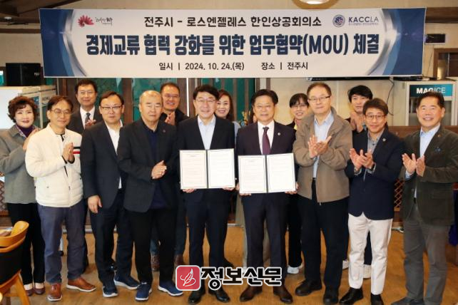 전주시와 LA한인상공회의소(회장 정동완)는 24일 완산구 노송동 소재 한 식당에서 우범기 전주시장과 정동완 회장을 비롯한 LA한인상공회의소 이사진 19명 등이 참석한 가운데 ‘경제교류 협력 강화를 위한 업무협약(MOU)’을 체결했다.