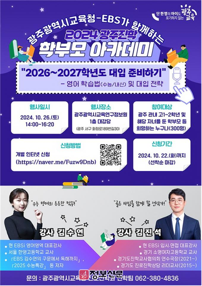 한편, 광주시교육청은 오는 12월 7일 중학교 3학년 학생과 학부모를 대상으로 올해 마지막 광주진학 학부모 아카데미를 개최한다.
