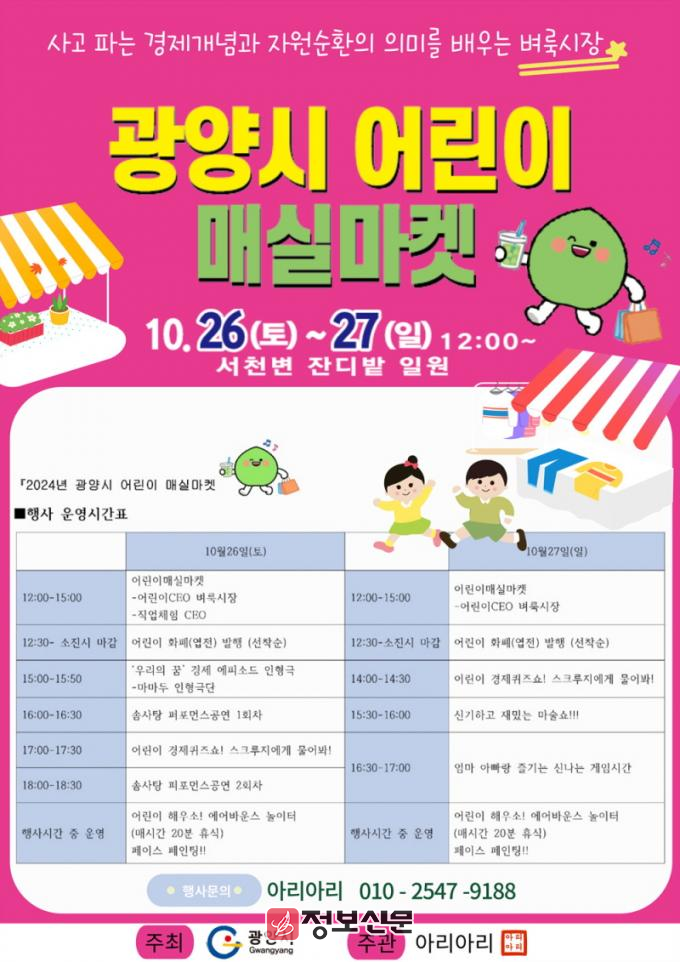 행사장에는 사용하던 물품을 사고파는 벼룩시장뿐만 아니라 직업 체험, 경제 인형극, 퀴즈쇼, 솜사탕 퍼포먼스 등의 프로그램들이 준비돼있다. 아울러 광양시 ‘어린이 놀이문화 프로그램’ 사업과 연계한 프로그램들과 버룩시장 수익금 일부를 자율적으로 기부할 수 있는 모금함이 함께 운영될 예정이어서 어린이들의 참여율이 높을 것으로 전망된다.