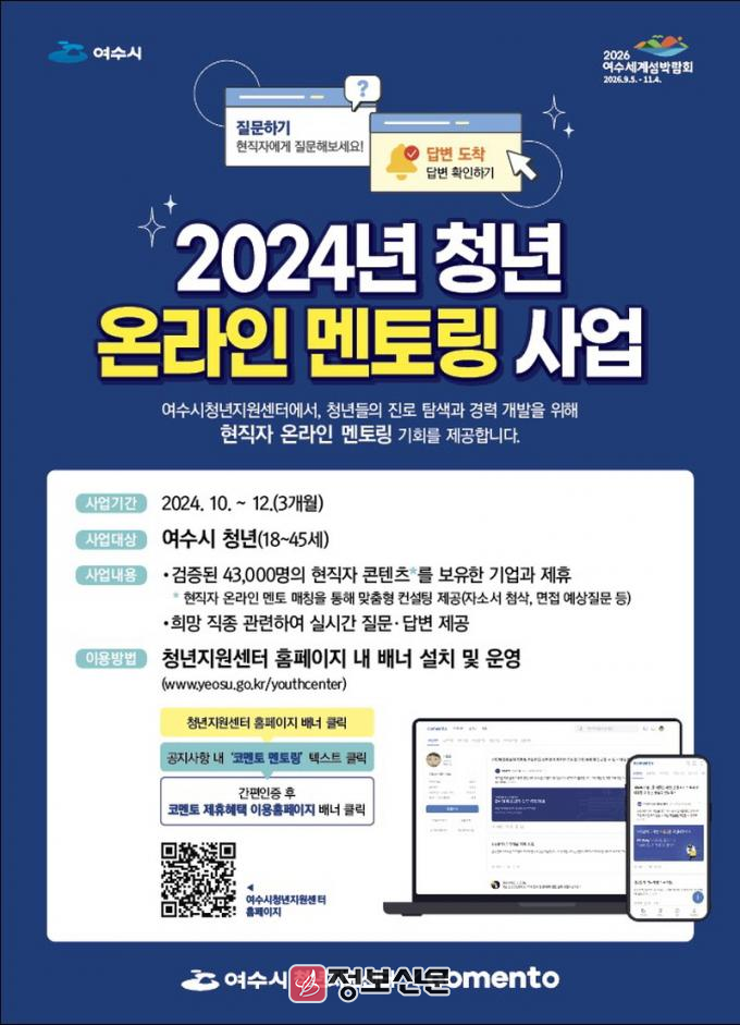 ![]() 여수시, 청년 취업 돕는 ‘현직자 온라인 멘토링’ 추진 |