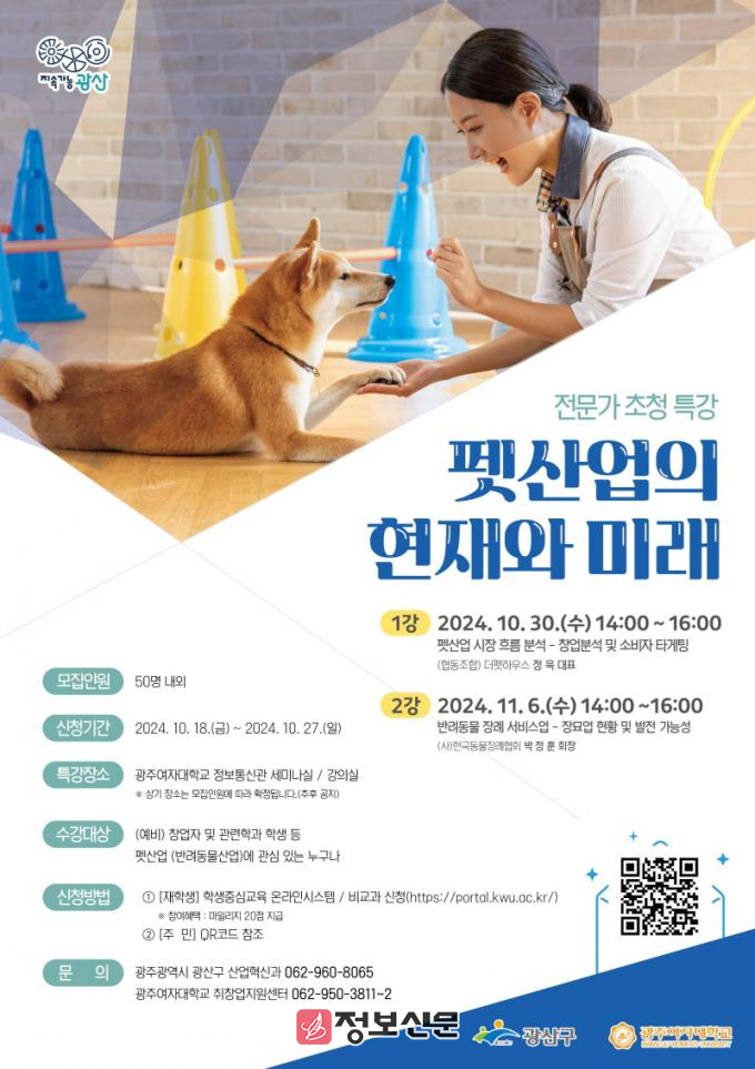 ‘펫산업의 현재와 미래’ 특강은 예비 창업자, 관련 학과 학생 등 펫산업에 관심 있는 누구나 참여할 수 있다. 신청은 광산구 누리집 ‘새소식’란에 게시된 특강 홍보 웹자보의 정보무늬(QR) 코드에 접속해 할 수 있다.