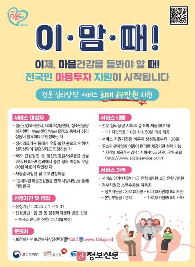 ‘전 국민 마음투자 지원사업’은 우울·불안 등 정서적 어려움이 있는 시민에게 대화 기반의 전문 심리상담 서비스를 제공한다.