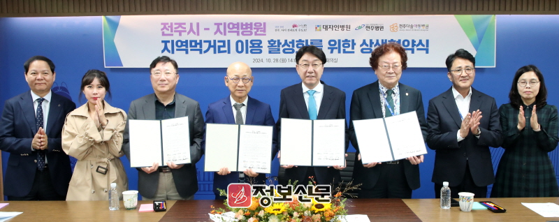 전주시는 28일 시청 3층 소회의실에서 대자인병원과 전주병원, 전주다솔아동병원 등 전주시 상생발전기업으로 선정된 지역병원 3곳과 ‘지역먹거리 이용 활성화를 위한 상생협약’을 체결했다.