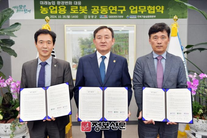 이병노 담양군수는 “이번 협약을 통해 첨단 농업기술의 허브로 발돋움할 계기를 마련하고, 스마트팜 및 인공지능 로봇을 활용한 효율적인 농업 생산 시스템을 구축할 것”이라며 “세 기관이 협력해 농업 생산성을 높이고, 환경친화적인 농업 모델을 개발해 지역사회 발전과 지속 가능한 미래 농업을 선도하겠다”라고 전했다.