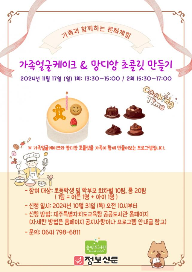 이번 행사는 가족이 서로 소통하고 화합할 수 있는 시간을 갖기위하여‘가족얼굴케이크와 망디앙 초콜릿 만들기’를 양지선 ㈜앙글방글 강사의 지도로 운영된다.