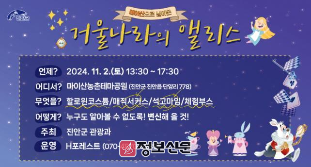 정난경 관광과장은 “야외활동 하기 좋은 가을날, ‘오늘 하루는 내가 마이산으로 날아온 앨리스’라고 생각하시면서 이색적인 분장과 행사장 분위기를 만끽하시는 소중한 시간 보내시길 바란다”고 말했다.