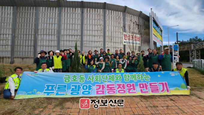 이번 행사에는 금호동 발전협의회, 통장협의회, 체육회, 새마을부녀회, 자율방범대, 주민자치위원회의 6개 사회단체와 금호동사무소 직원 등 50여 명이 참여해 마을감동정원 조성 대상지에 겹벚나무와 각종 사초류, 그라스류를 식재했다.