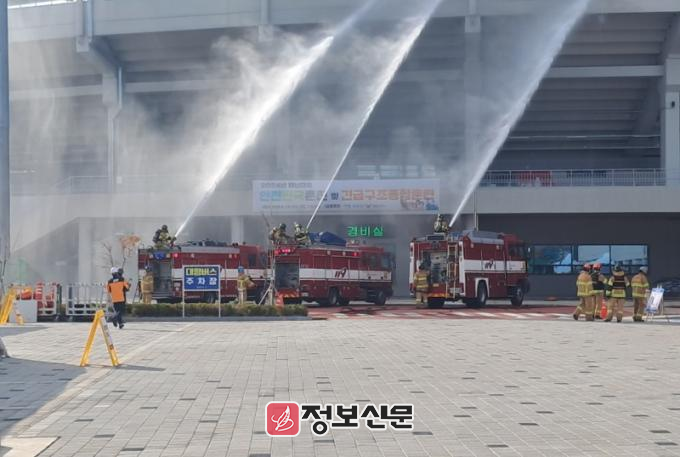 또한, 목포종합경기장에서 진행된 현장훈련에는 소방차, 구급차 등 차량 및 장비 40여 대가 동원됐다. 목포소방서, 목포경찰서, 군부대를 비롯한 유관기관과 민간 안전 관련 단체들이 참여한 이번 훈련은 약 1시간 30분 동안 징후 감지, 초기 대응, 비상 대응, 수습 복구, 평가 순서로 진행됐다.
