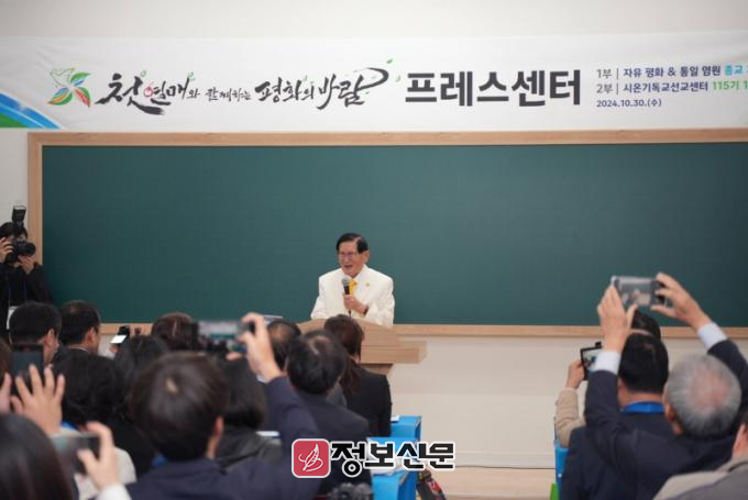 ![]() [사진제공:신천지예수교회]30일 정오 신천지 청주교회에서 ‘시온기독교선교센터 115기 11만 연합 수료식’이 진행된 가운데 이만희 총회장이 기자들을 만나 언급하고 있는 모습. |