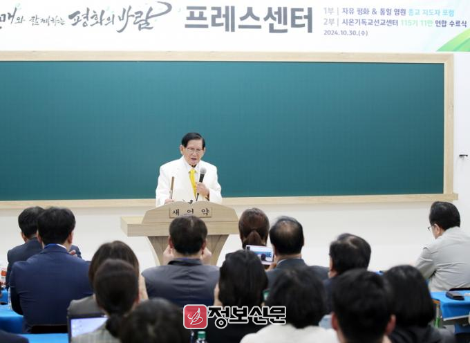 신천지예수교 증거장막성전(이하 신천지예수교회)의 이만희 총회장이 당초 파주 임진각 평화누리에서 진행하려 했던 ‘종교지도자 포럼 및 수료식’이 일방적인 대관 취소에 대해 30일 신천지 청주교회에서 수료식을 진행하며 이같이 언급했다.
