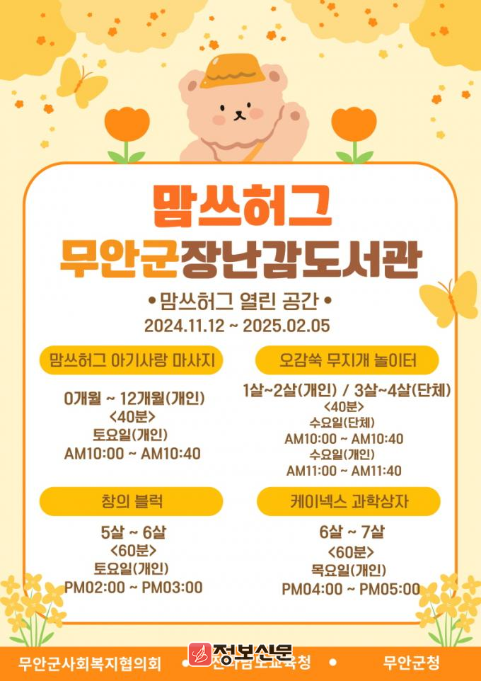 군은 무안군교육지원청에서 지역사회연계 영유아 프로그램 사업비 15백만원을 지원받아 ▲맘쓰허그 아기사랑 마사지 ▲오감쑥 무지개 놀이터 ▲창의블럭 ▲케이넥스 과학상자 등의 프로그램을 2024년 11월 12일부터 2025년 2월 5일까지 운영한다.