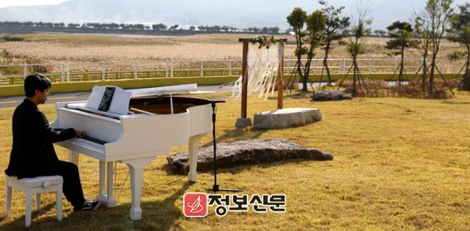 강진만 생태홍보관 앞마당에 피아노 포토존이 마련된 가운데 연주자의 피아노 선율에 갈대가 춤을 추고 있는 듯하다.