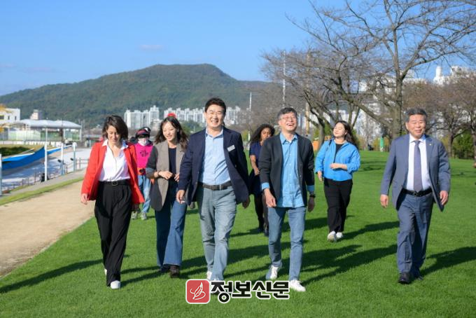 ![]() 순천시 노관규 순천시장이 순천으로 본사를 이전하는 글로벌 웹툰기업 케나즈·오노코리아 두 대표와 함께 그린아일랜드를 걷고 있다 |