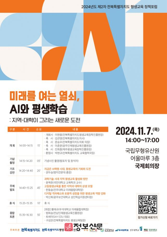 참가 신청 및 포럼 관련 문의는 전북특별자치도평생교육장학진흥원 홈페이지(www.jbiles.or.kr) 또는 평생교육부(063-276-8311)로 하면 된다.