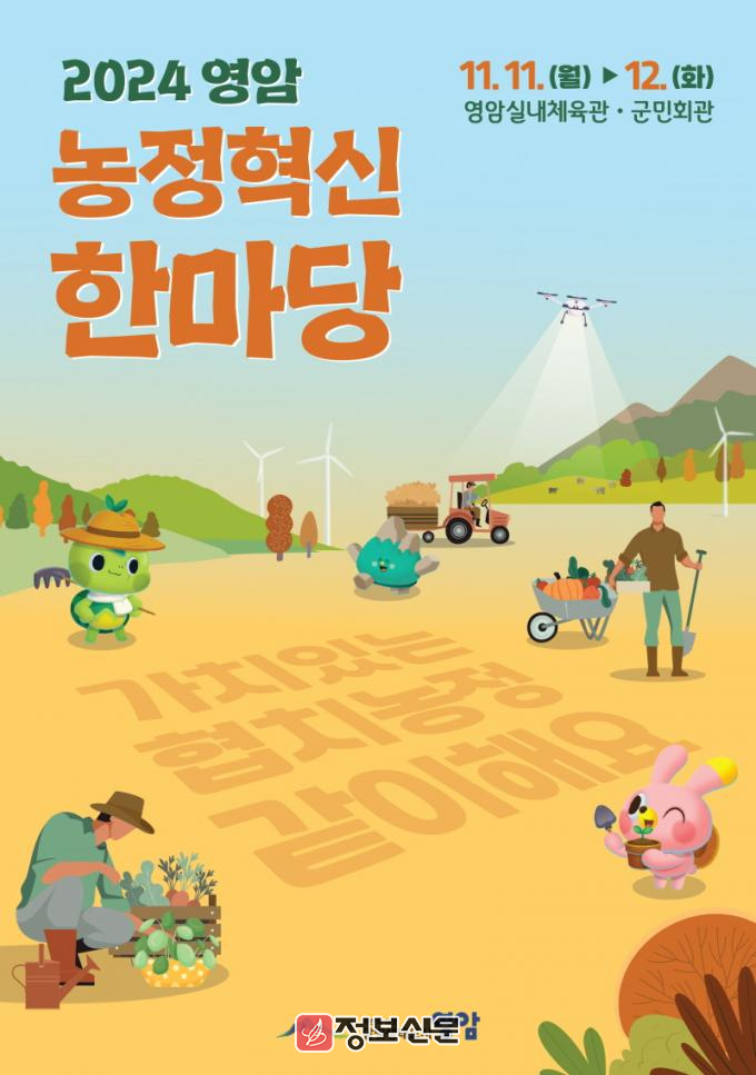 영암군(군수 우승희)이 이달 11~12일 영암실내체육관에서 ‘2024 영암 농정혁신한마당’을 개최한다. 농업인의 날을 맞아 ‘가치 있는 협치 농정, 같이해요’를 구호로 열리는 이번 행사는, 지역사회 구성원들이 한자리에 모여 협치로 영암의 미래 농업 혁신 방안을 마련하는 자리다.
